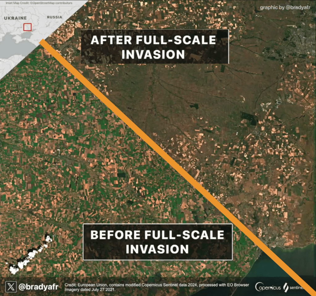 The war in Ukraine is one of the only recent conventional, industrial wars, and in terms of men and materiel. It is by far the largest war of the 21st century, so it is not surprising that it has created major environmental problems. Because the fighting has disrupted agricultural activity, the front lines of the war are even visible from space. A “green belt” of fallow fields, where trees and ground cover have sprung up in the absence of cultivation, can be seen marking the zone of conflict. The effects on the land will almost certainly be long-lasting, as large amounts of unexploded ordnance create hazards even after a war is over. Old land mines and other unexploded munitions injure people and animals in other former conflict zones, such as Bosnia and Cambodia. Also, munitions such as shells and bombs contain heavy metals and environmental toxins that leach into the water supply and soil, which can render crops unsafe to eat and poison aquatic life.