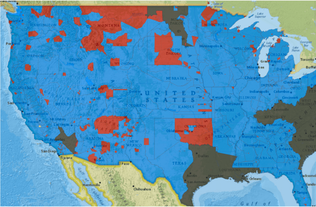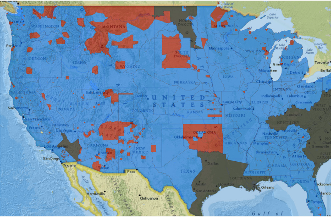 Red: Current reservations or land with most native sovereignty.