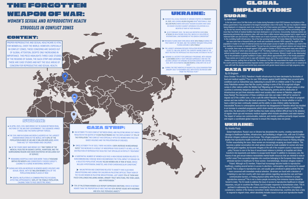 Climate & Health, MagazineThe Forgotten Weapon of War: Women’s sexual and reproductive health struggles in conflict zones By Sadie Nelson, Eli Brigham, and Amelia Pauly Share on Facebook (Opens in new window) Facebook Share on LinkedIn (Opens in new window) LinkedIn Email a link to a friend (Opens in new window) Email Print (Opens in new window) Print Related