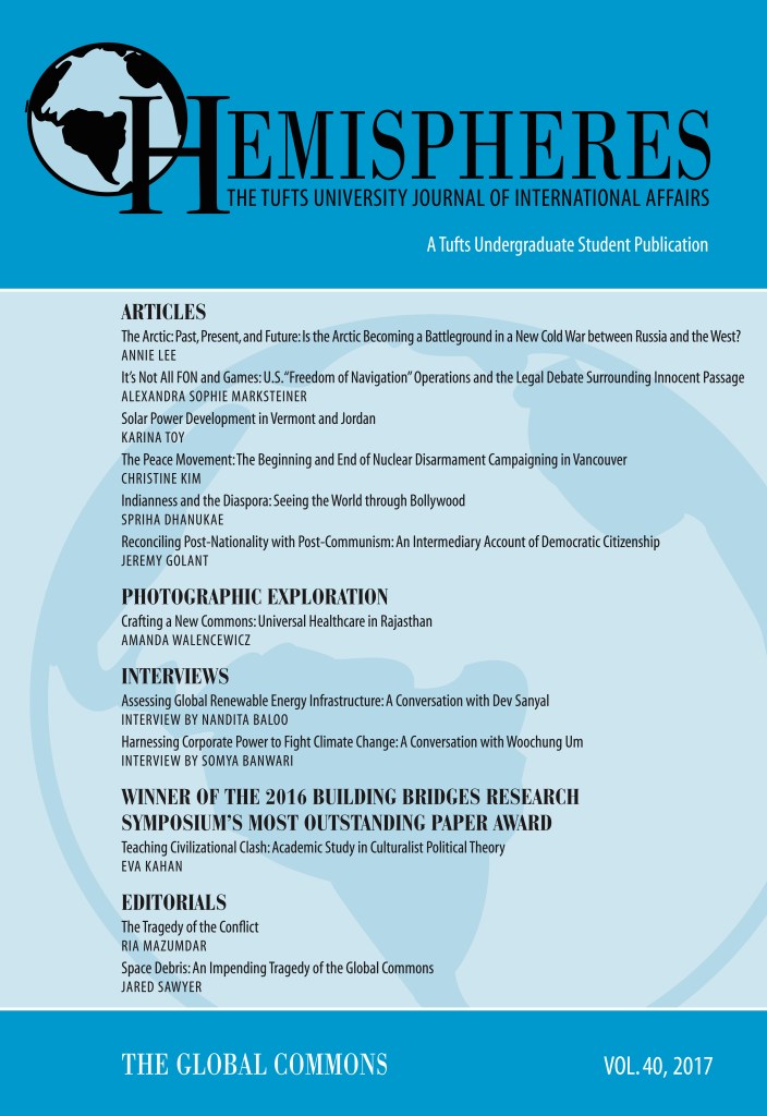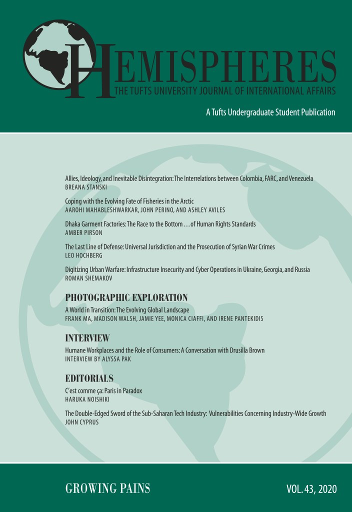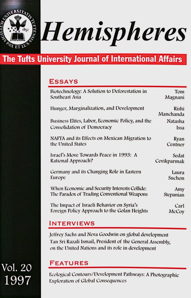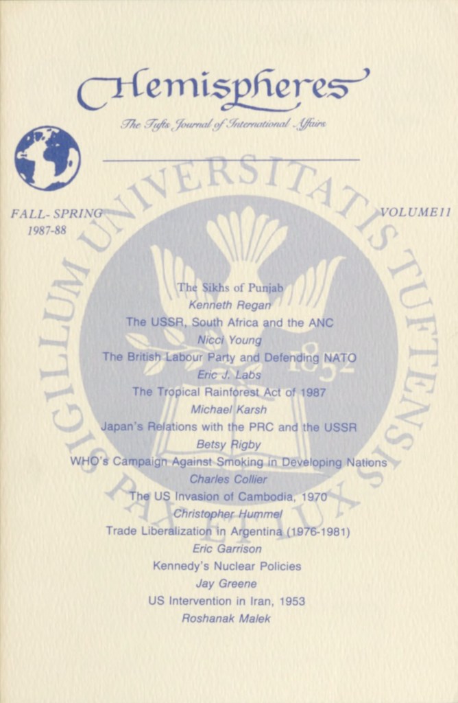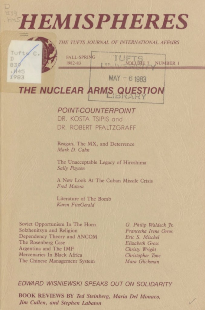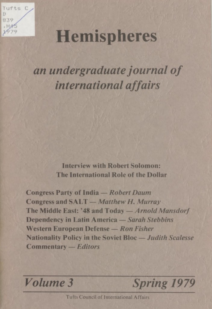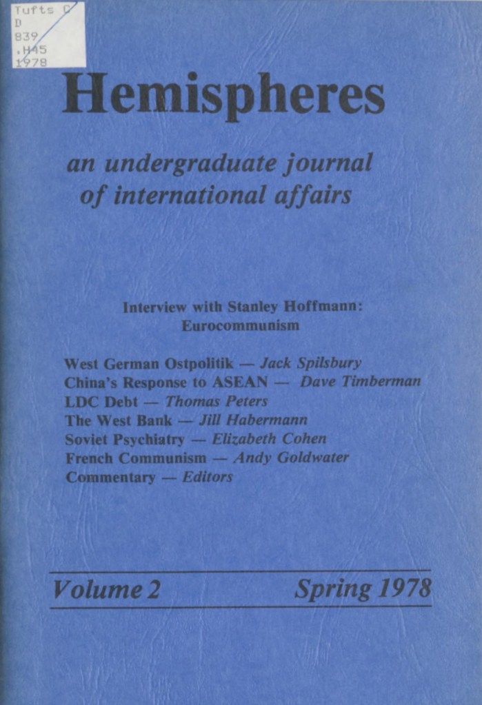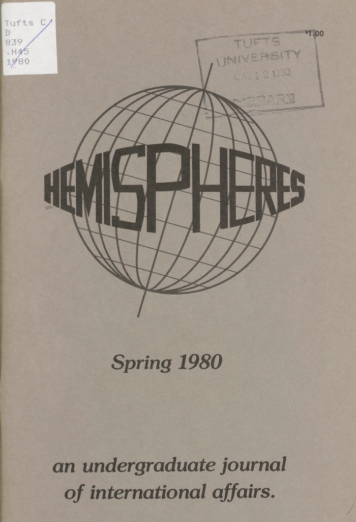 Hemispheres formed in 1976 and published its first issue in spring 1977. Over the nearly fifty years since then, our journal has evolved considerably—in content, layout, and style. We extend sincere thanks to the staff at Tufts Archival Research Center for providing a digital library of volumes published after 2000, as well as access to and scanning permissions for older physical holdings.