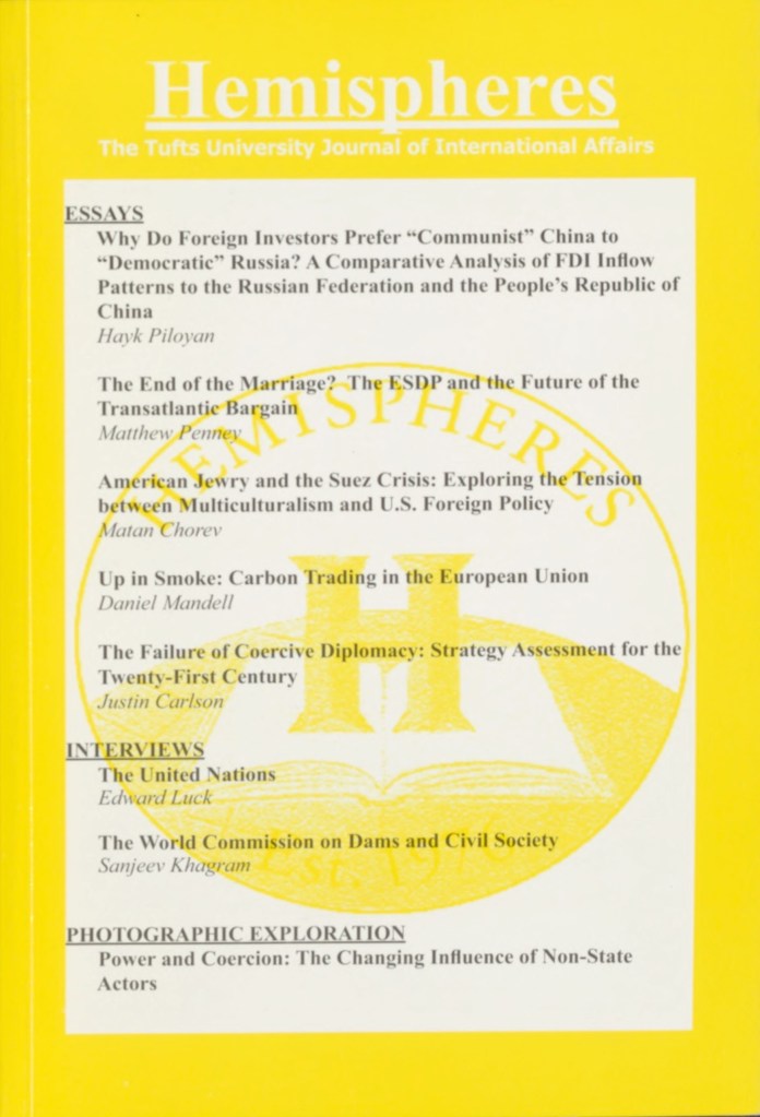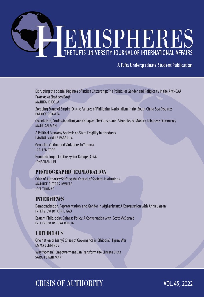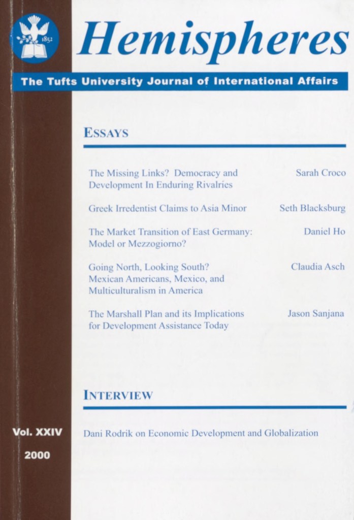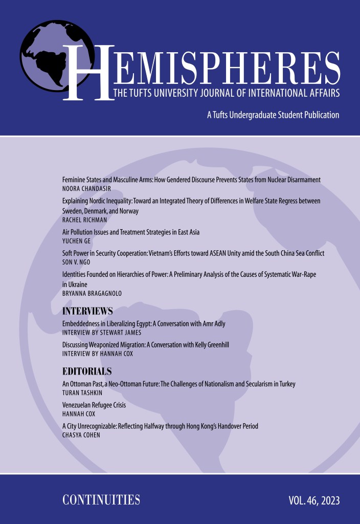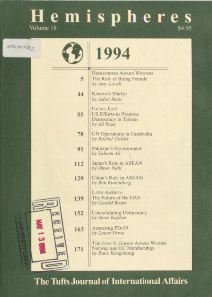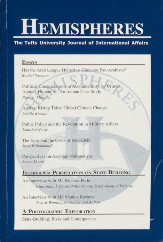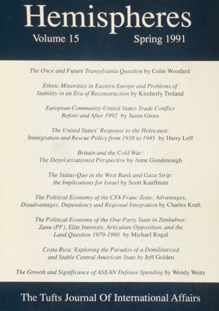 Hemispheres formed in 1976 and published its first issue in spring 1977. Over the nearly fifty years since then, our journal has evolved considerably—in content, layout, and style. We extend sincere thanks to the staff at Tufts Archival Research Center for providing a digital library of volumes published after 2000, as well as access to and scanning permissions for older physical holdings.