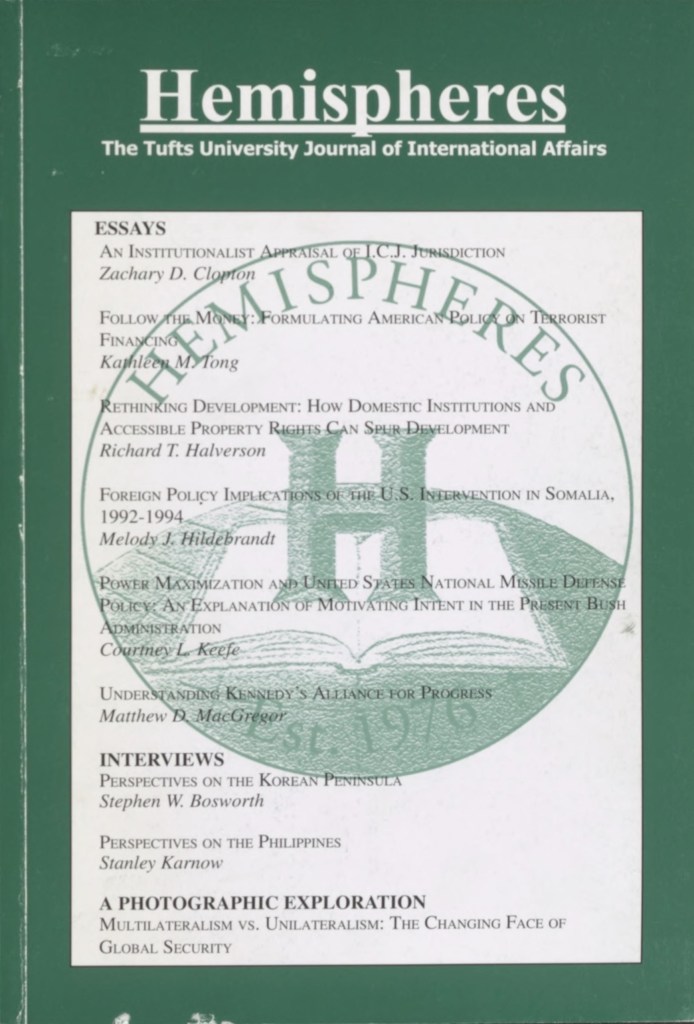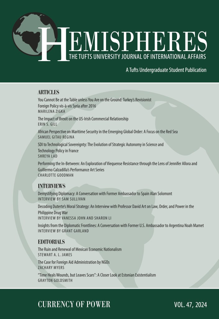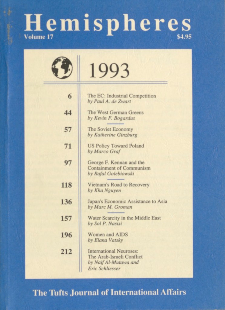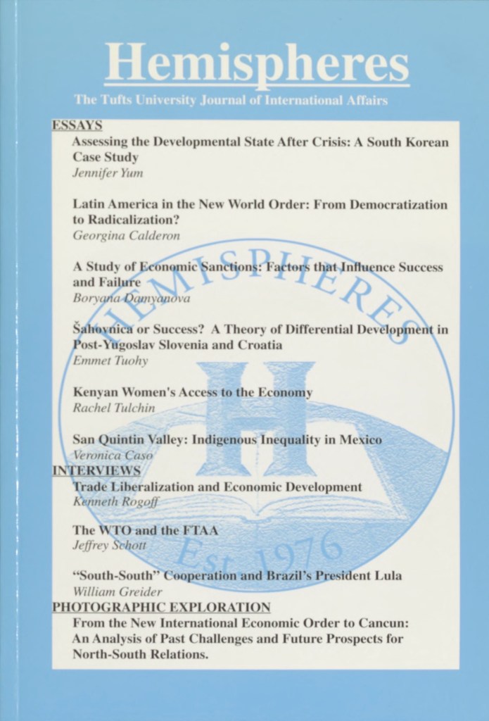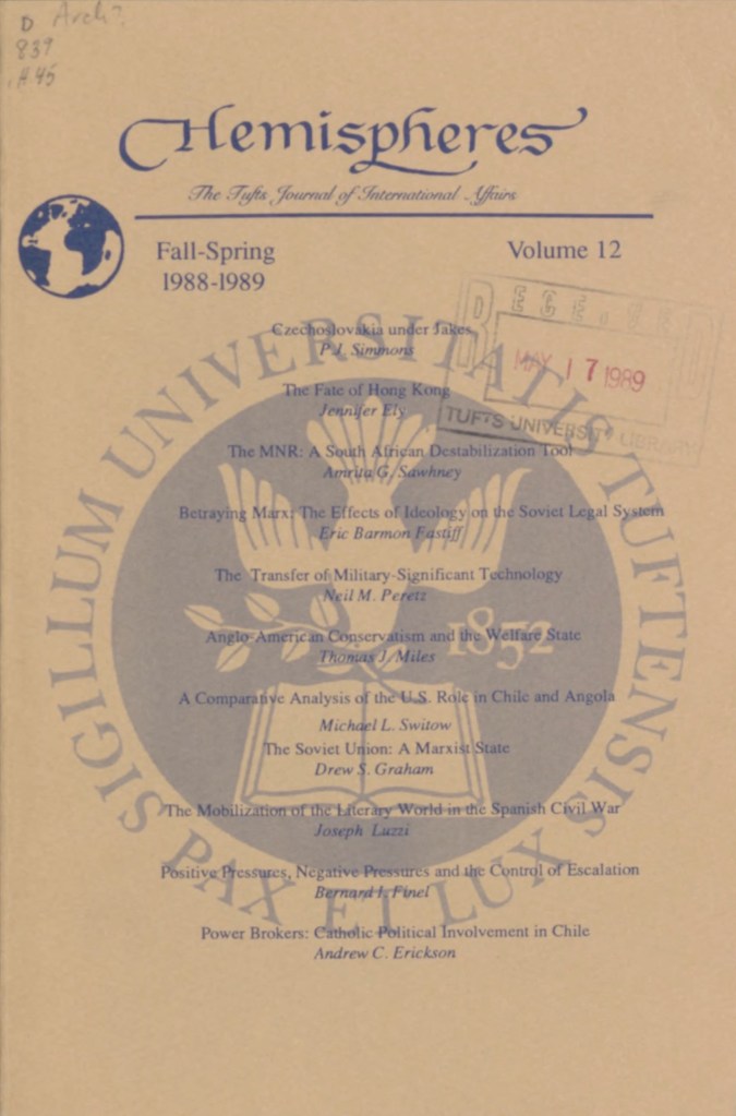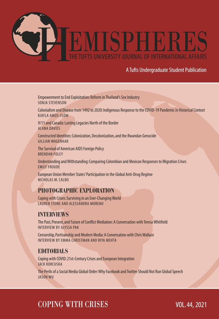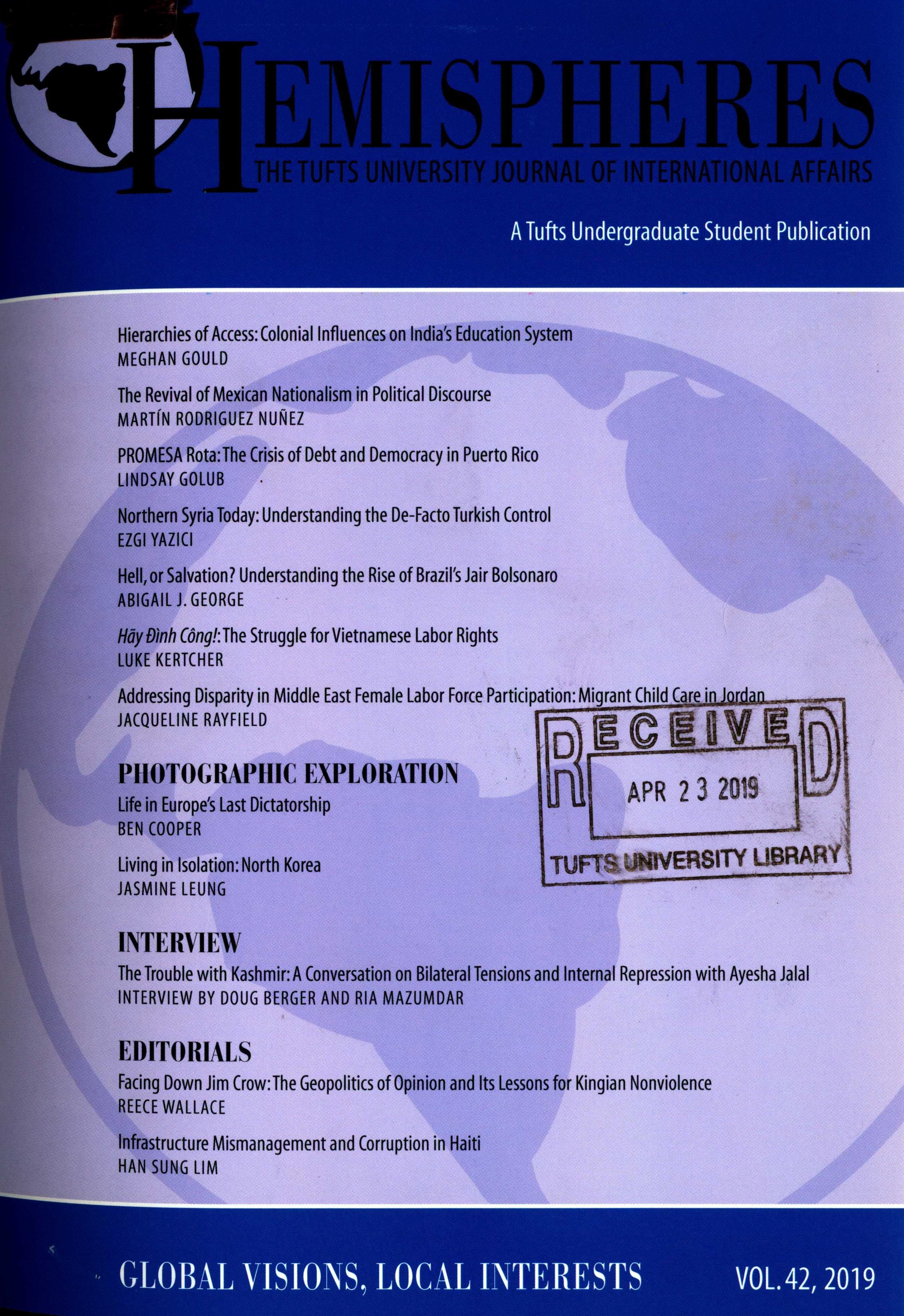 Hemispheres formed in 1976 and published its first issue in spring 1977. Over the nearly fifty years since then, our journal has evolved considerably—in content, layout, and style. We extend sincere thanks to the staff at Tufts Archival Research Center for providing a digital library of volumes published after 2000, as well as access to and scanning permissions for older physical holdings.