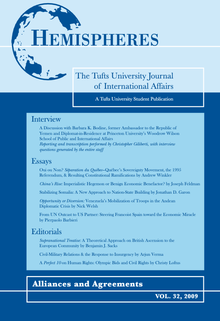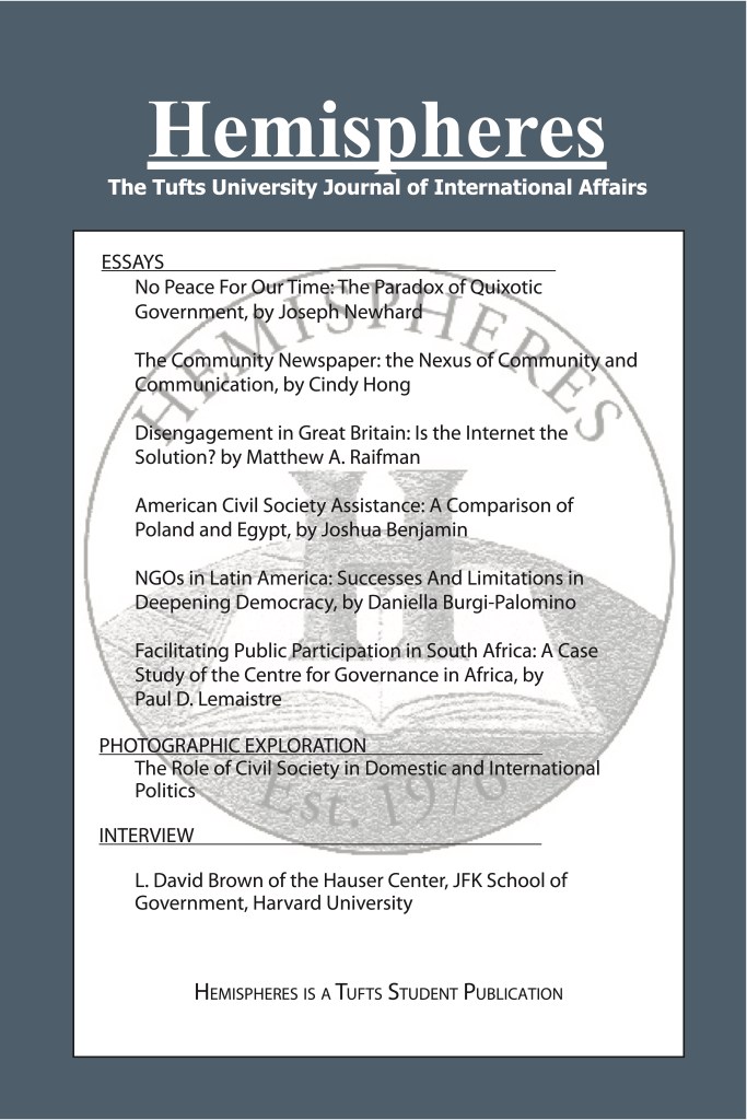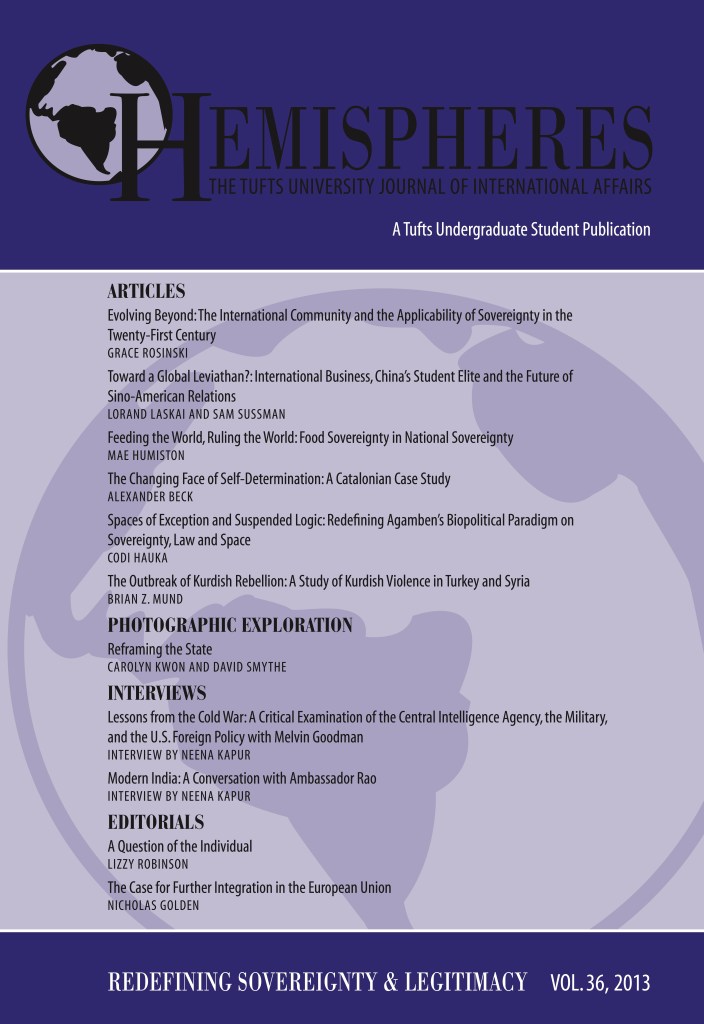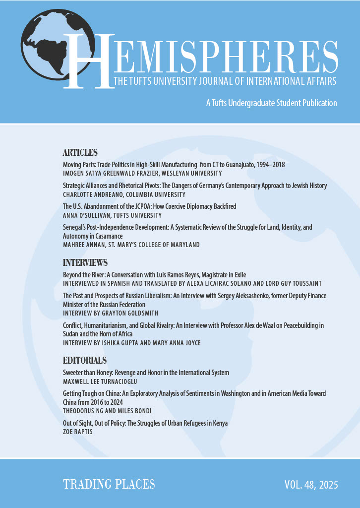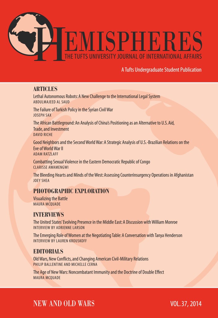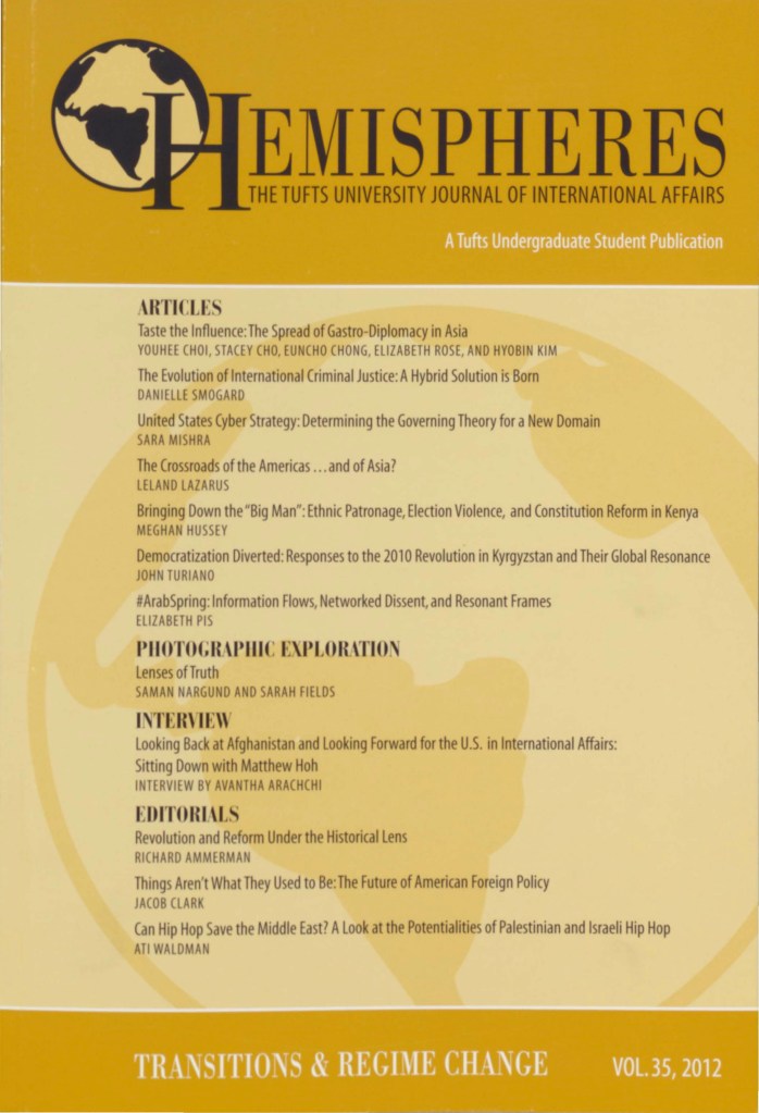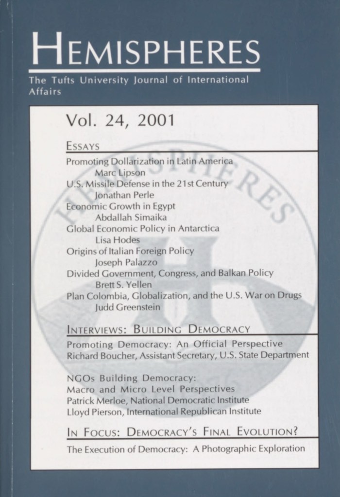 Hemispheres formed in 1976 and published its first issue in spring 1977. Over the nearly fifty years since then, our journal has evolved considerably—in content, layout, and style. We extend sincere thanks to the staff at Tufts Archival Research Center for providing a digital library of volumes published after 2000, as well as access to and scanning permissions for older physical holdings.